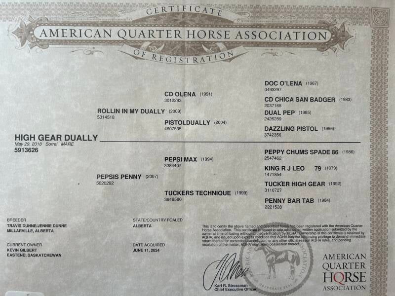 Dezi is one of my favourite mares. Of course because of her impeccable breeding but also because she is so sweet! She is always the first to greet me in the pasture, loves attention and her oats! She is extremely big bodied, huge hip, good feet, nice big eyes. Absolutely perfect in every way. She is in foal to Metallic Spark for 2026.