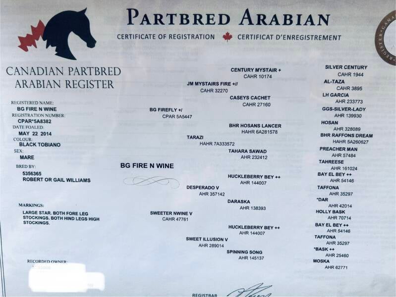 Magic is a black and white registered Partbred Arab (high percentage Arabian). 11 years old and going very well under saddle. Has been being used in the pasture this spring to check cattle during calving and is unfazed by anything. Lots of indoor arena riding as well. Magic is extremely easy to catch, stands for the farrier perfectly, loves attention. She is an extremely sweet mare, very loving. Stands about 14.2 hh.