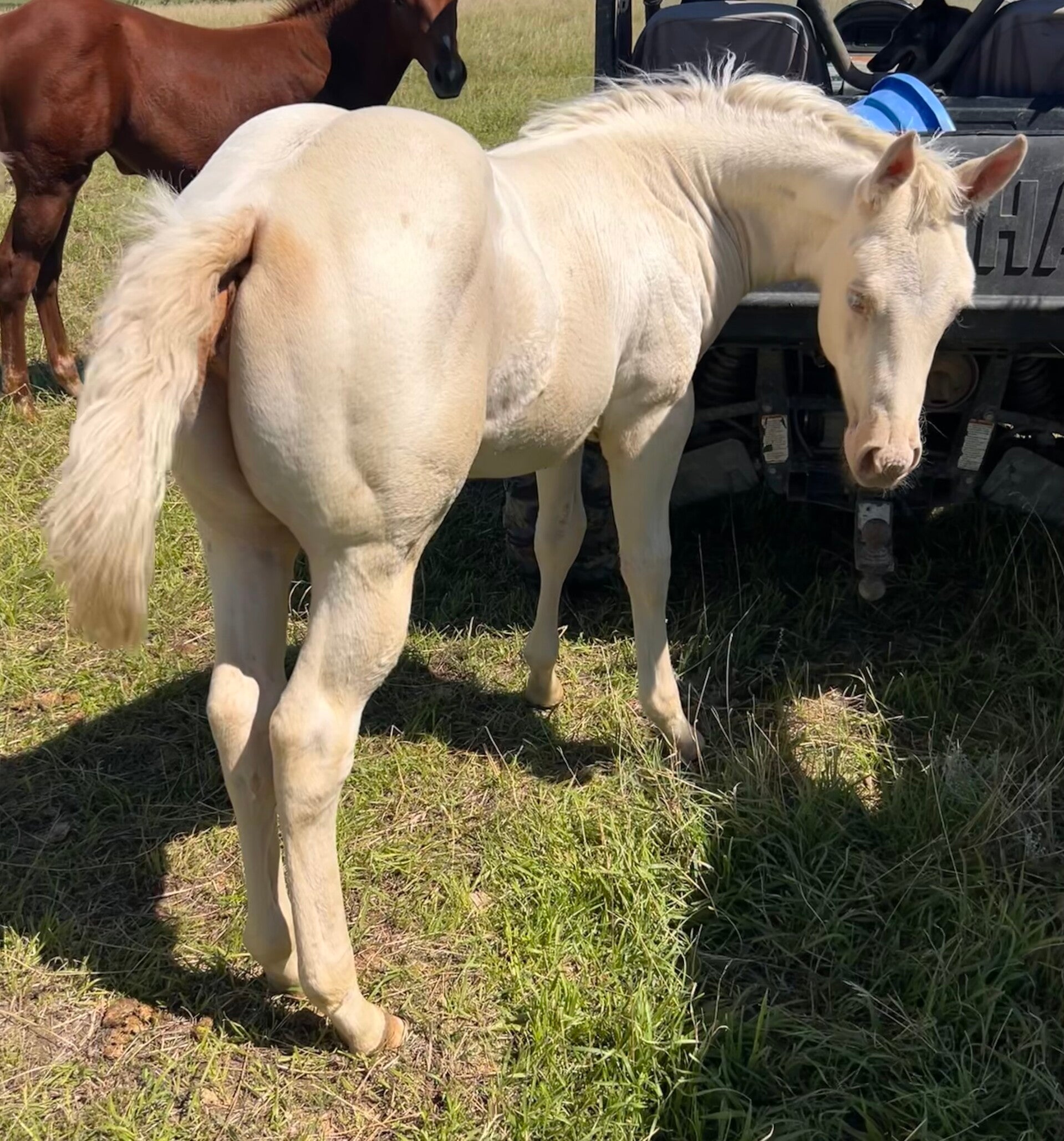 Gorgeous Palomino filly, Dam has been a working ranch horse for many years. Sire is an accomplished reining horse and is now successfully competing in team roping. This filly will likely finish around 15 hh. Should be athletic and thick built.